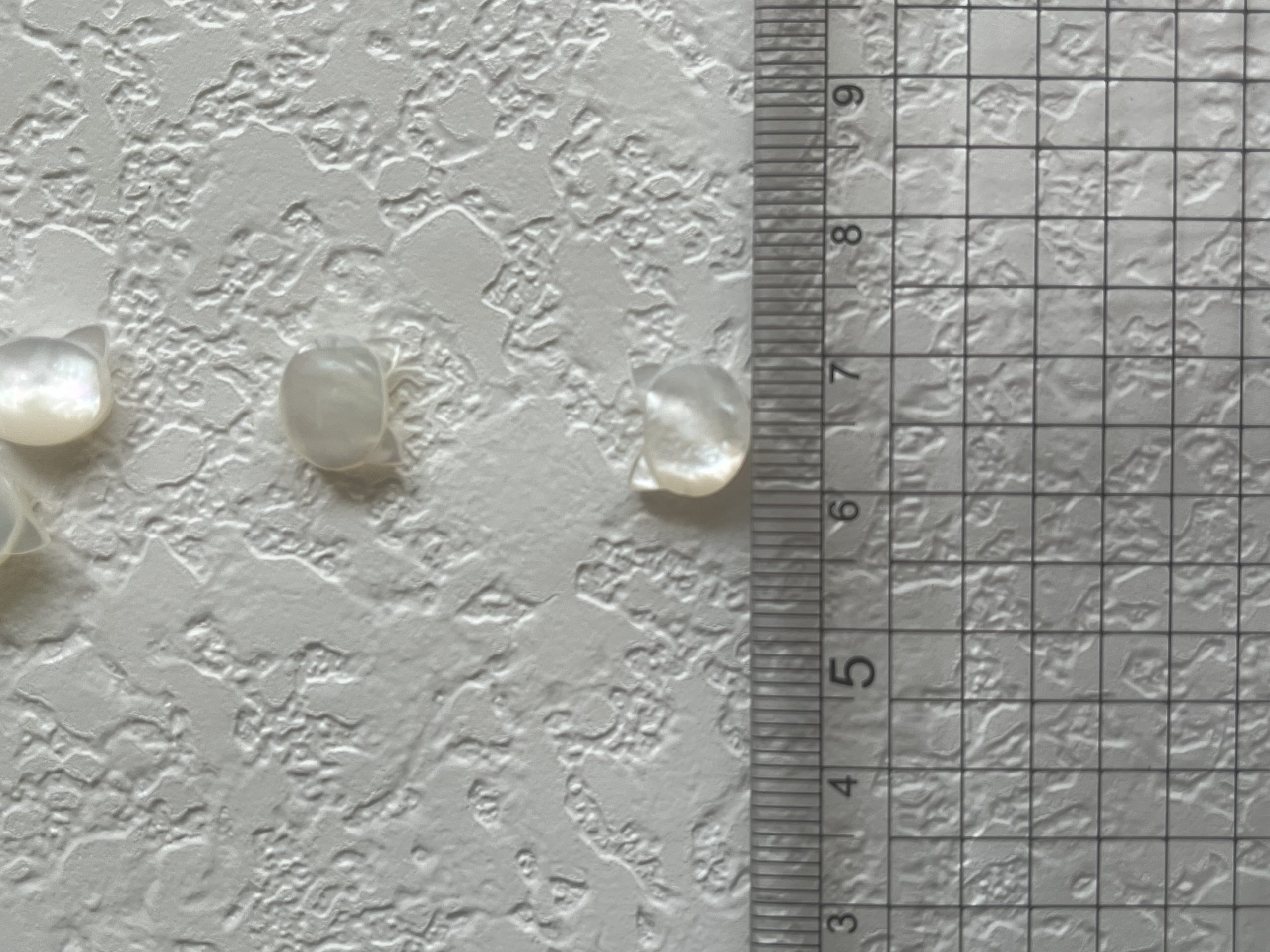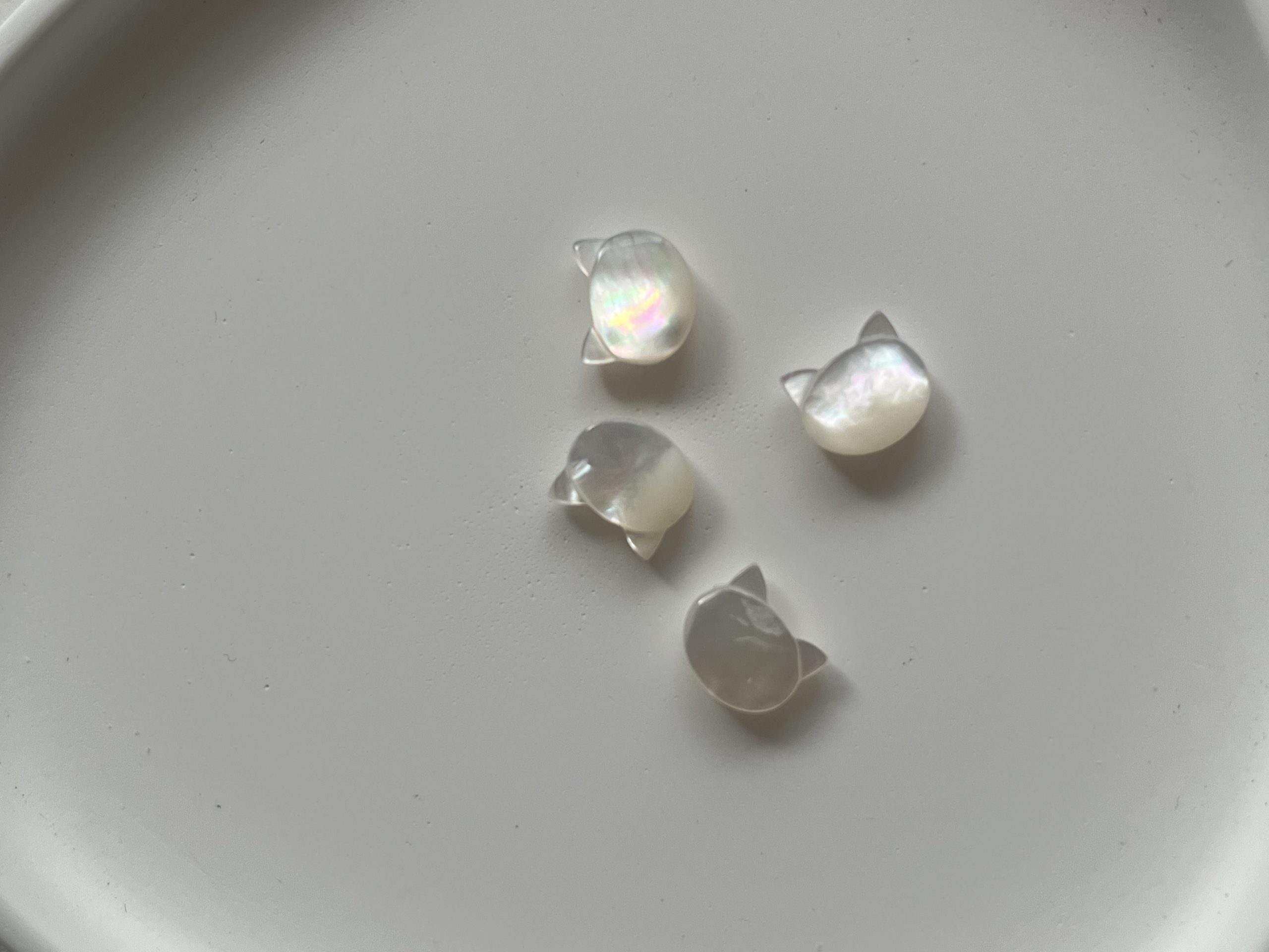 天然の**マザーオブパール(白蝶貝)**を丁寧にカットし、角度によって美しい虹色の輝きを放つデザインに仕上げました。