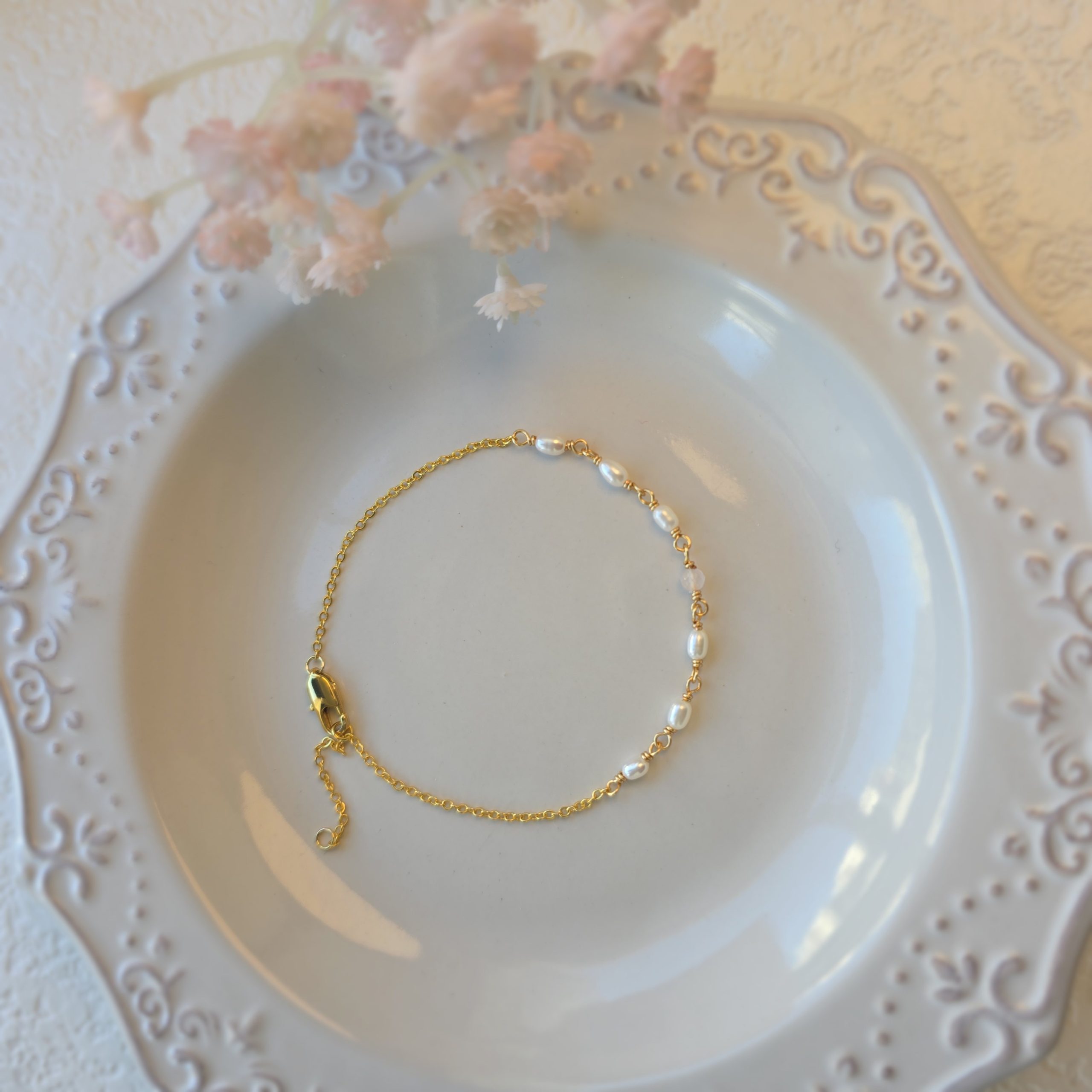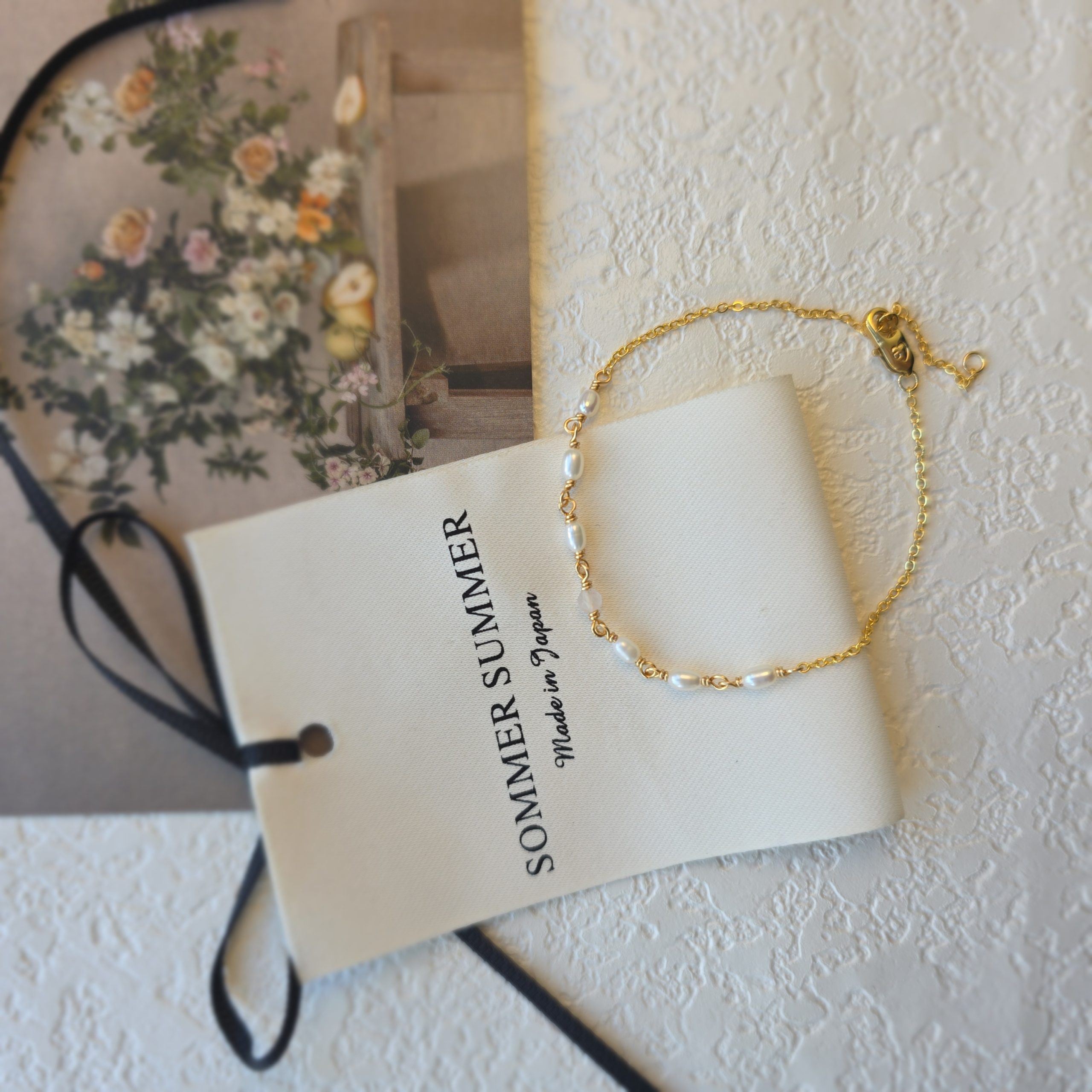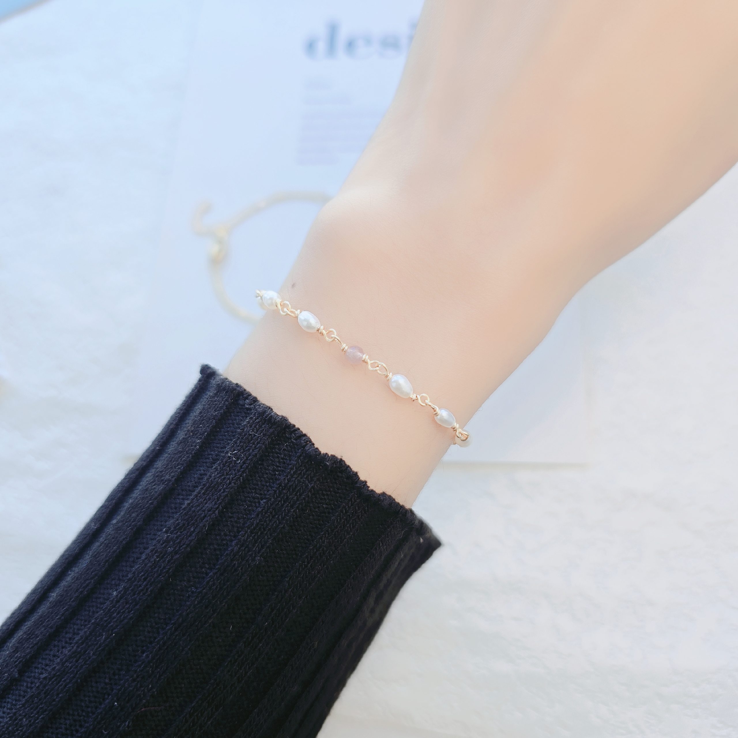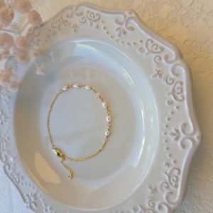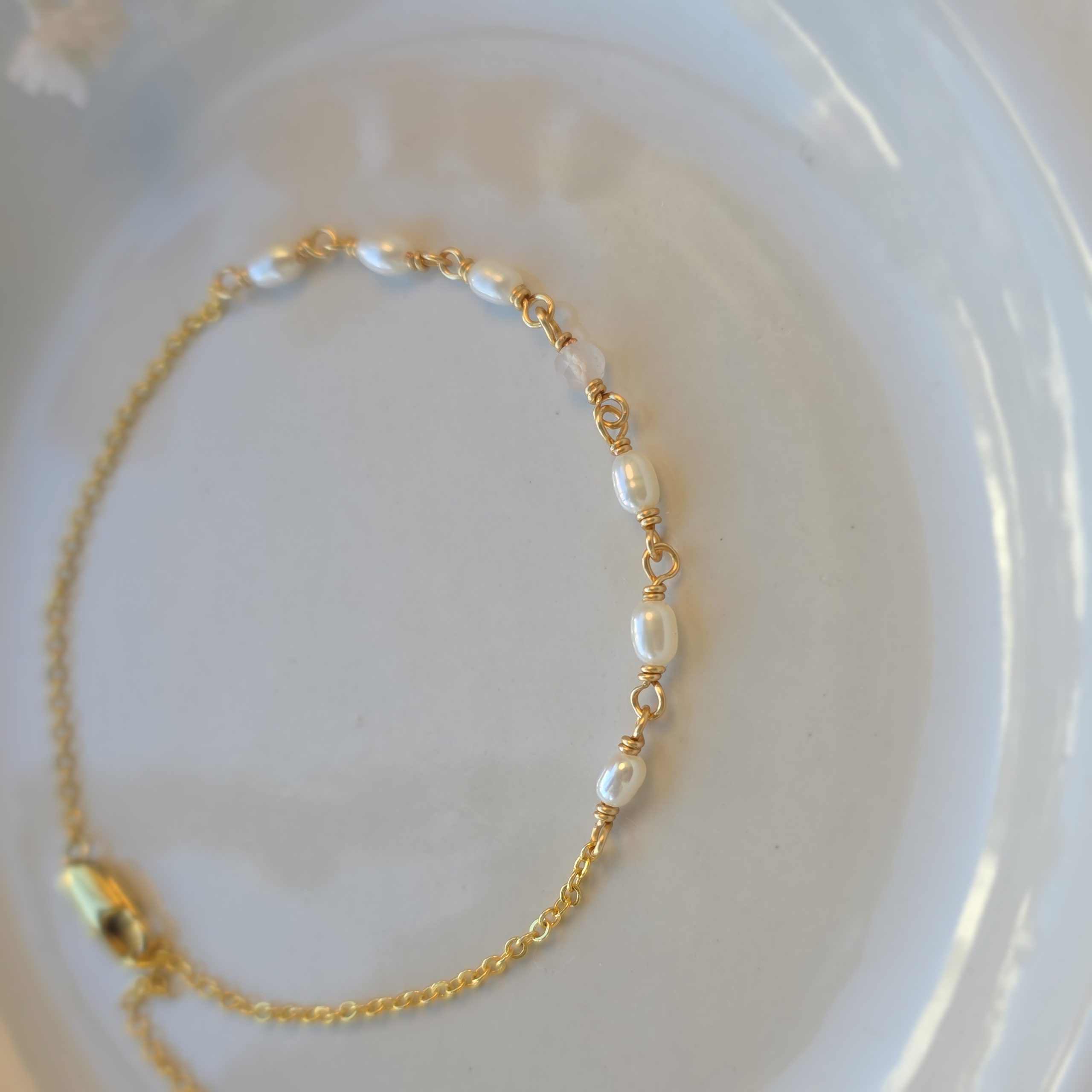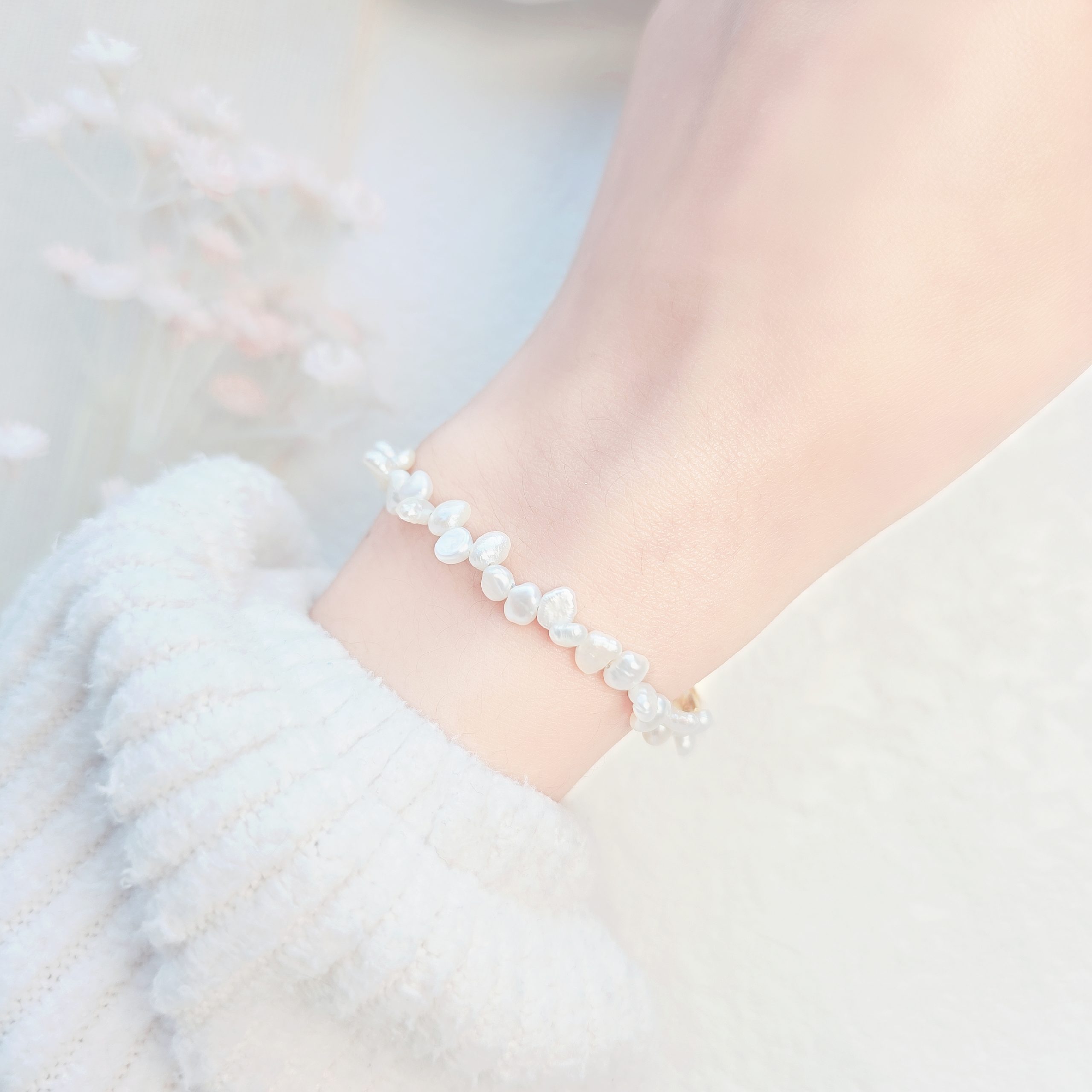 ♡中央にそっと輝く天然石と、左右に上品な艶めきを添えるパールを組み合わせたバランスブレスレット。